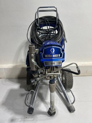 Pulverizador Graco Ultra Max II 695 en color azul y plateado. - Diseño con ruedas para fácil transporte. - Manguera de alta presión enrollada. - Panel de control SmartControl.