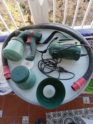 Sistema de pulverización de pintura Bosch PFS 2000. - Incluye pistola, depósito y manguera. - Color verde y negro.