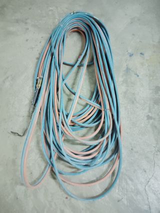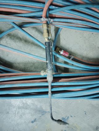 Se trata de una manguera de soldadura autógena de unos 40 mt de larga del año 15/16. No tiene ninguna fuga e incluye válvulas de seguridad antiretroceso y soplete.
