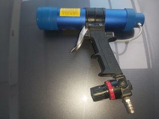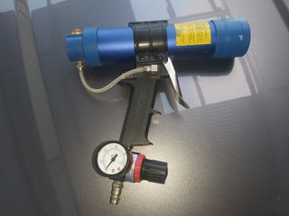 Pistola de pegamento para vidrio con manómetro. - Cuerpo de aluminio azul. - Gatillo ergonómico. - Manguera de conexión de aire. - Manómetro para control de presión.