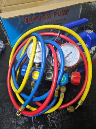 Se vende bomba de vacío con mangueras y manómetros. Ideal para trabajos de refrigeración. - Mangueras de colores (rojo, azul, amarillo). - Dos manómetros de alta y baja presión. - Válvulas de control.