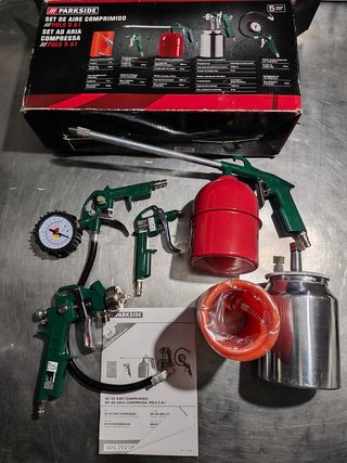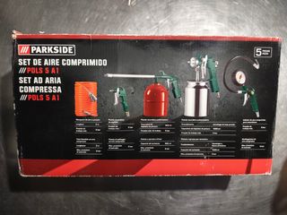 Set de aire comprimido Parkside PDLS 5 A1. - Nuevo. - Manguera de aire a presión de 5 m. - Pistola neumática pulverizadora con depósito de 900 ml. - Pistola neumática pulverizadora con depósito de 1000 ml. - Pistola de soplado. - Inflador de aire comprimido con manómetro. -> Puede verlo sin compromiso.