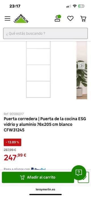 Puerta corredera de cristal y aluminio. Modelo ESG CFW31245. - Medidas: 76x205 cm. - Color: Blanco.