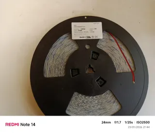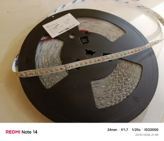 Tira de LED MEICON modelo SPLENDOR R32. - Potencia: 12W/M - Color: 2700K - Tensión: 24V/DC - LEDs: 128 por metro - Longitud: 20 - Certificación CE y RoHS.