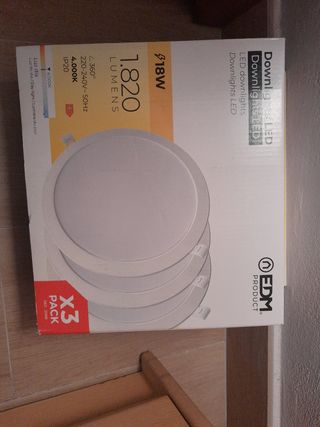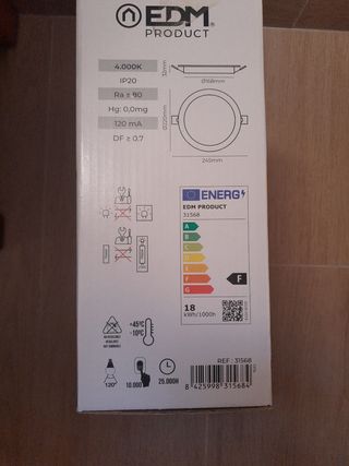 Pack de 2 focos LED Downlight de la marca EDM. - Potencia: 18W - Flujo luminoso: 1820 lúmenes - Temperatura de color: 4000K (Luz día) - Ángulo de apertura: 360° - Voltaje: 220-240V~50Hz - Protección: IP20 - Referencia: 31568