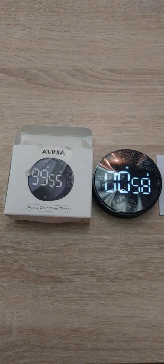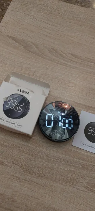 Temporizador digital de cuenta regresiva con diseño moderno y pantalla LED. - Control rotatorio para ajustar el tiempo. - Pantalla digital clara. - Compacto y portátil.