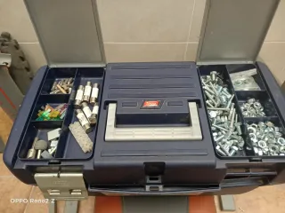 Práctica caja de herramientas Teyg.Se vende con la herramienta.Llave de carraca con vasos desde el 4 hasta el 22,llaves fijas hasta la 27, llaves mixtas, juego llaves Allen, juego de brocas doradas,diferente tornillería con arandelas y tuercas,martillo,sierra,llave inglesa,4 llaves de tubo,cepillos,lima,alicates, varios fusibles,varias llaves de codo