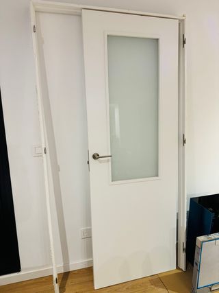 Puerta de comedor de dos hojas, abatible y completamente nueva. - Diseño moderno con panel de cristal. - Acabado en blanco.