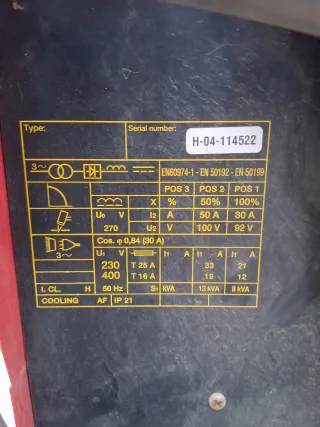 Cortador de plasma marca Plasmalok, modelo 55. - Voltaje de entrada: 230 V / 400 V. - Frecuencia: 50 Hz. - Corriente de corte: 25 A / 16 A. - Potencia aparente: 13 kVA / 8 kVA. - Clase de aislamiento: H. - Protección: IP 21.