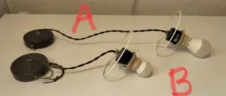 Set de portalámparas con cable para techo. A: Largo cable con casquillo 50 cm. B: 170 cm. Ajustar a su medida. Se puede poner pantalla o una bombilla grande de decoración. - Incluye dos portalámparas. - Tapa cables techo. - Cableado para instalación eléctrica. Hago envíos. Puedo añadir varias cosas en un solo paquete.