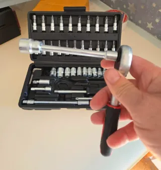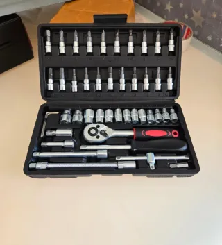 Set completo de herramientas manuales para diversas tareas. - Incluye llaves de vaso de diferentes tamaños. - Variedad de puntas para atornillar. - Mango de carraca ergonómico. - Extensor flexible para difícil acceso.