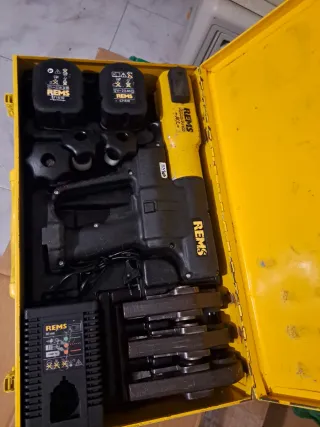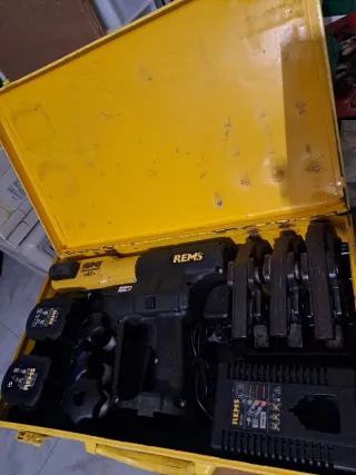 Herramienta de prensado REMS en su maletín amarillo. - Incluye dos baterías REMS 12V-2.0Ah. - Cargador REMS 60 min. - Juego de mordazas de prensado.