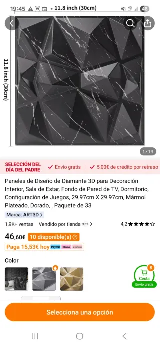 Paneles decorativos 3D con diseño de diamante y acabado en mármol. Ideales para dar un toque moderno a cualquier estancia. - Medidas: 29.97cm X 29.97cm. - Acabado: Mármol plateado/dorado. - Paquete de 33 unidades.