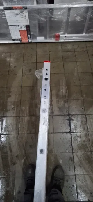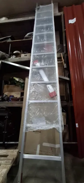 Escalera de aluminio con 12 peldaños, ideal para trabajos en altura. Se encuentra en buen estado y lista para su uso. - Material: Aluminio - Número de peldaños: 12 Los agujeros que tiene la Escalera se hicieron como prueba para fijar en una máquina, nunca se a usado.