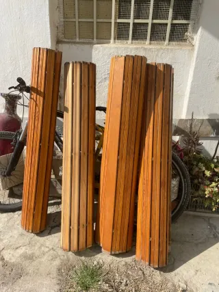 Se venden persianas de madera enrollables, ideales para dar un toque rústico a tu hogar o negocio. Están hechas de listones de madera barnizada. - Material: Madera barnizada. - Diseño: Listones verticales. - Estilo: Enrollable.