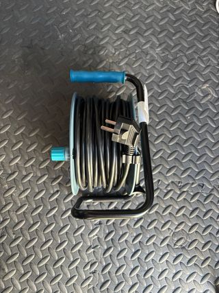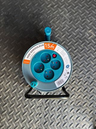 alargadera enrollacables de 15 metros con 4 enchufes, homologada nueva a estrenar con sistema de seguridad. - Longitud del cable: 15 metros. - Número de enchufes: 4. - Color: Gris y azul. - Certificación: NF, CE.