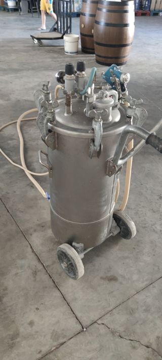 Equipo completo formado por calderín de 60 litros de acero inoxidable y pistola para gotelé y productos texturizados en perfecto estado de uso. Marca Sagola.