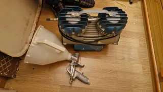 Equipo para aplicar gotelé, compuesto por compresor y depósito (se pueden vender por separado). El compresor tiene un filtro de aire roto, pero funciona perfectamente. Se vende por jubilación, precio negociable. - Compresor Balma. - Depósito para material. - Manguera y embudo.