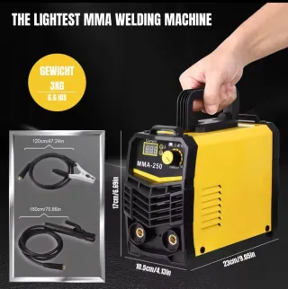 Máquina de soldar MMA-250, ideal para trabajos de soldadura. - Modelo MMA-250. - Pantalla digital para visualización de corriente. - Control de amperaje ajustable. - Incluye cables de soldadura y pinzas.