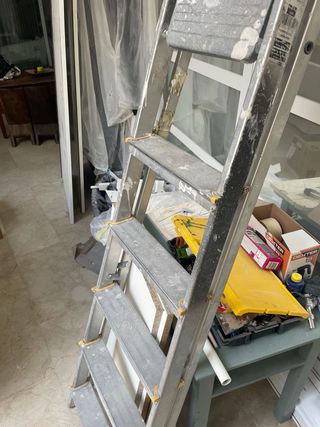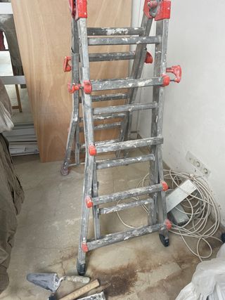 Se vende lote de escaleras y herramientas de obra. - Escalera multiusos de aluminio. - Paleta de albañil. - Paletín. - Cuerda enrollada.