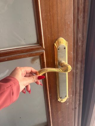 Puerta de madera maciza con marco incluido. Ideal para interiores. - Diseño con paneles de cristal. - Tirador dorado inoxidable
