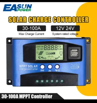 Regulador de carga solar MPPT de 100A, compatible con sistemas de 12V y 24V. Ideal para optimizar la carga de tus baterías solares. - Pantalla LCD para visualización de datos. - Puertos USB para carga de dispositivos (5V 2A). - Indicadores de estado de carga y funcionamiento. - Diseño compacto y robusto. 2 unidades disponibles..