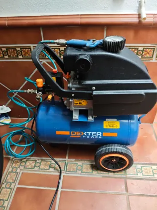 Compresor de aire Dexter Power en color azul. - Depósito de aire. - Ruedas para facilitar el transporte. - Manómetro para control de presión. - Asa para su manejo.