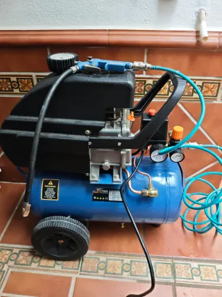 Compresor de aire en buen estado, listo para usar. - Diseño compacto y robusto. - Acabado en color azul y plateado. - Incluye etiqueta de advertencia.
