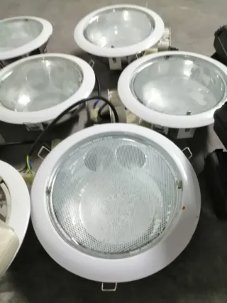 Lotes de focos para iluminación de tiendas o locales comerciales o campos. Son de empotrar y tienen un diseño moderno. - Cuerpo blanco. - Cristal protector. - 10€ unidad. (Pregunte por precio por lote) - Funcionan perfectamente.