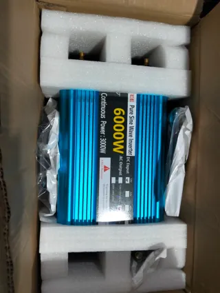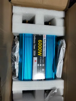 Inversor de onda sinusoidal pura con potencia continua de 3000W. - Potencia continua: 3000W - Potencia máxima: 6000W - Voltaje de entrada DC: 12V o 24V - Voltaje de salida AC: 220V-240V - Diseño de carcasa de aluminio azul.