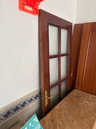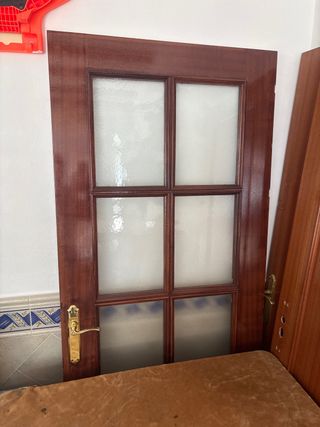 Puerta de madera con diseño de cristalera. - Paneles de cristal translúcido. - Tirador dorado. - No tiene bisagras