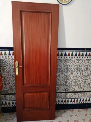 Puerta de madera para interiores con un diseño clásico y elegante. - Acabado en madera de tono cálido. - Diseño con panel superior e inferior. - Incluye manilla dorada.