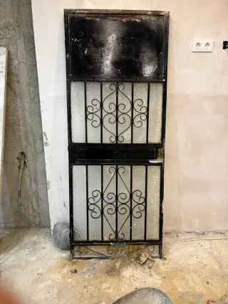 Puerta de San Juan con un diseño clásico y elegante. - Estructura metálica negra. - Paneles de cristal esmerilado. - Detalle de rejas forjadas con motivos ornamentales.