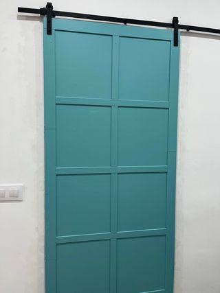 Puerta corredera de diseño panelado con herrajes negros. - Color: Azul verdoso. - Estilo: Rústico/Industrial. - Incluye sistema de riel y ruedas.