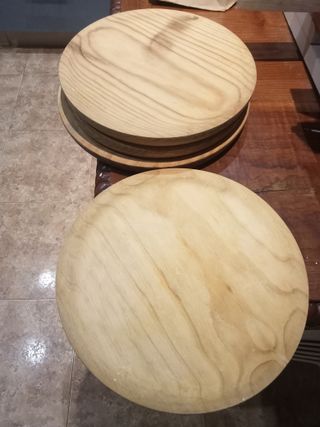 Conjunto de seis tablas de madera con forma redonda. Son ideales para cocina (preperación de pinchos, embutidos, pizzas, etc.) - Material: Madera. - Forma: Redonda. - Cantidad: 6 unidades.