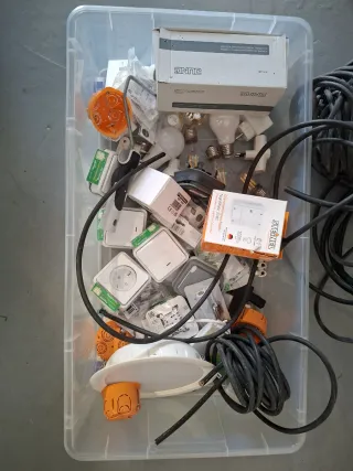 Lote de material eléctrico variado. - Cajas de registro naranjas. - Caja de registro blanca. - Cables eléctricos. - Caja de la marca JUNG.