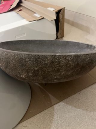 Lavamanos de diseño con acabado en piedra natural. Su forma ovalada y material le dan un toque rústico y elegante. - Material: Piedra natural. - Forma: Ovalada. - Acabado: Rústico.