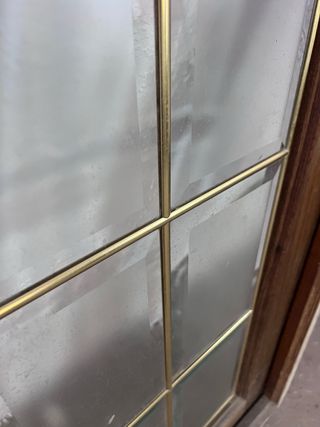 Cristalera de madera Teka con diseño de paneles. - Marco de madera Teka. - Paneles de cristal esmerilado con divisiones doradas.