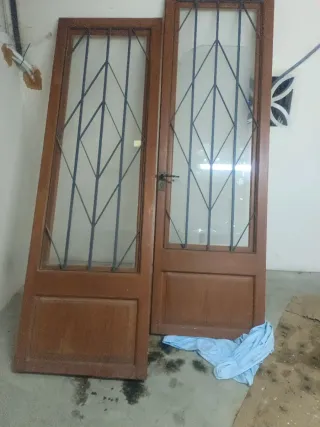 Puerta de madera con detalles en hierro y reja de seguridad. - Marco de madera. - Diseño con reja de hierro. - Panel de vidrio. 228 de alto 73 ancho cada puerta Total 146 cm . Las cristaleras se abren