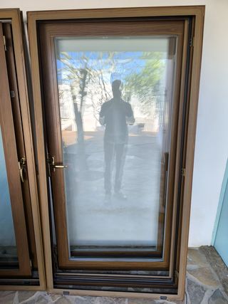 Conjunto de cinco ventanas balconeras con acabado en color roble. - Sistema Climalit con marco de PVC - Ventanas de 1 hoja de aprox. 90x210 cm. - Acabado imitación madera de roble. - Manillas y acabados de color dorado. - Diseño moderno y elegante. * Cada ventana cuesta 300€. Precio total rebajado: 1.200€.