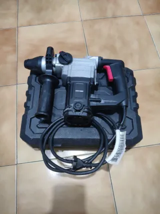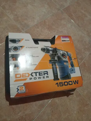 Martillo perforador Dexter de 1500W de potencia; ideal para trabajos de construcción, demolición y perforación. Se encuentra en perfecto estado y listo para utilizar (solo se ha usado una vez). Se entrega en su maletín original. - Incluye maletín de transporte. - Mango auxiliar para mayor control. - Cable de alimentación. - Potencia: 1500W.