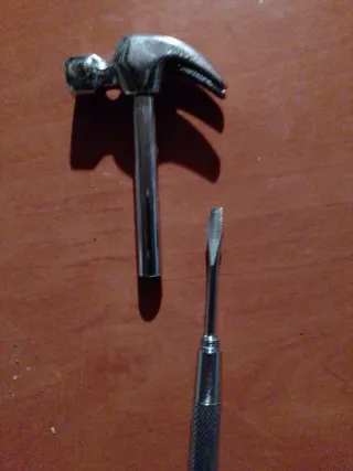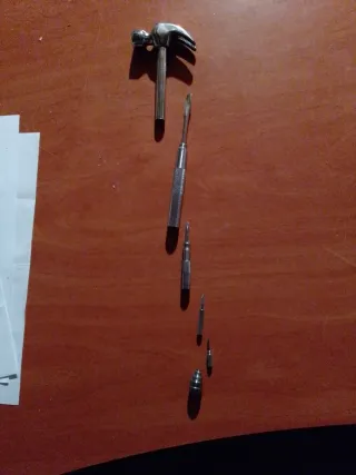 Herramienta compacta que combina un martillo y un destornillador con varios accesorios. 4 destornilladores en el interior del mango. - Mango con acabado moleteado para mejor agarre. - Incluye puntas de destornillador de diferentes tamaños. - Diseño metálico plateado.