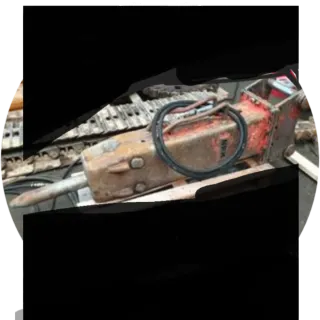 Martillo hidráulico para maquinaria pesada. Se encuentra en buen estado, con signos de óxido superficial.