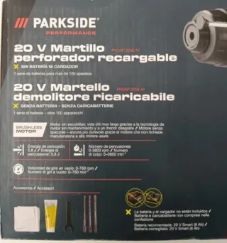 Martillo perforador recargable Parkside Performance de 20V. - Motor Brushless. - Batería y cargador no incluidos.