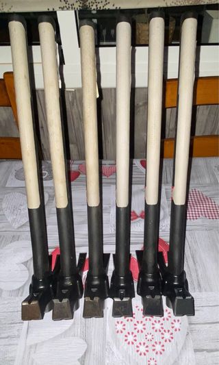 Se venden 6 martillos bellota con mangos de madera y empuñadura negra. - Mangos de madera. - Empuñadura negra. - Cabezal de metal.