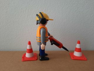 Playmobil figura completa de obrero construcción, operario con accesorios (martillo neumático y conos). Esta figura procede de la revista número 19 de la colección de Blue Ocean. En perfecto estado.