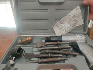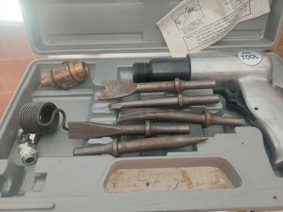 Estuche de martillo neumático en buen estado con 6 cinceles incluidos. - Cincel neumático para trabajos de demolición o construcción. - Incluye 6 cinceles de diferentes formas y tamaños. - Se encuentra en su caja original. - Ideal para profesionales o aficionados al bricolaje.
