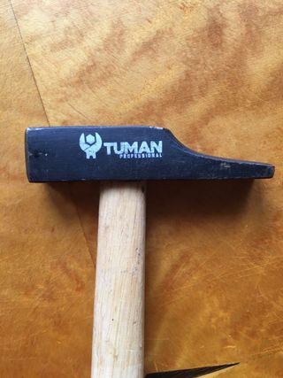 Martillo de la marca TUMAN con mango de madera y empuñadura roja. - Mango de madera. - Empuñadura de color rojo. - Logo de la marca TUMAN visible.