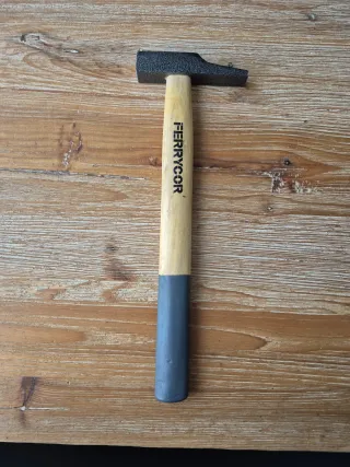 Martillo de cerrajero de la marca Ferricor. Mango de madera con parte inferior pintada en gris. - Cabeza de metal. - Mango de madera.