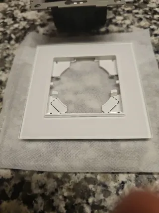 Conjunto de enchufe Schuko y marco embellecedor de cristal. - Enchufe Schuko de alta calidad. - Marco embellecedor con acabado en cristal blanco.